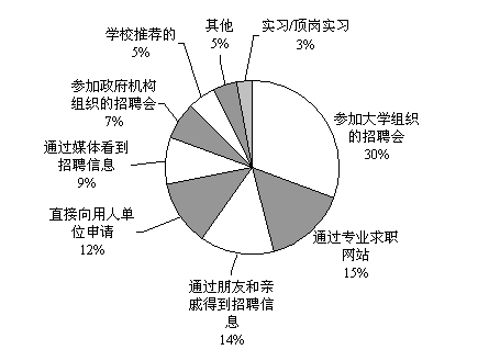 掌握丰富的就业信息无疑就意味着更多的机会,根据麦可思调查结果,大学毕业生求职时获取信息的渠道确实有很多,如下图中列举的招聘会、利用周围的人际关系、专业求职网站、直接向用人单位了解,等等。