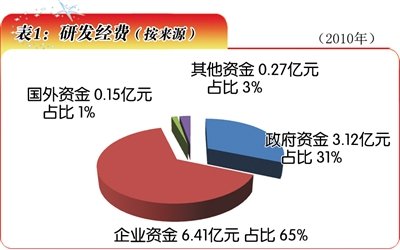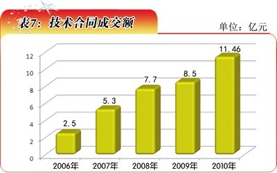 “十一五”时期,青海省全社会研发经费逐年增长。2006年该项支出为3.34亿元,2010年增至9.94亿元,占地区生产总值的比重为0.74%(表1)。